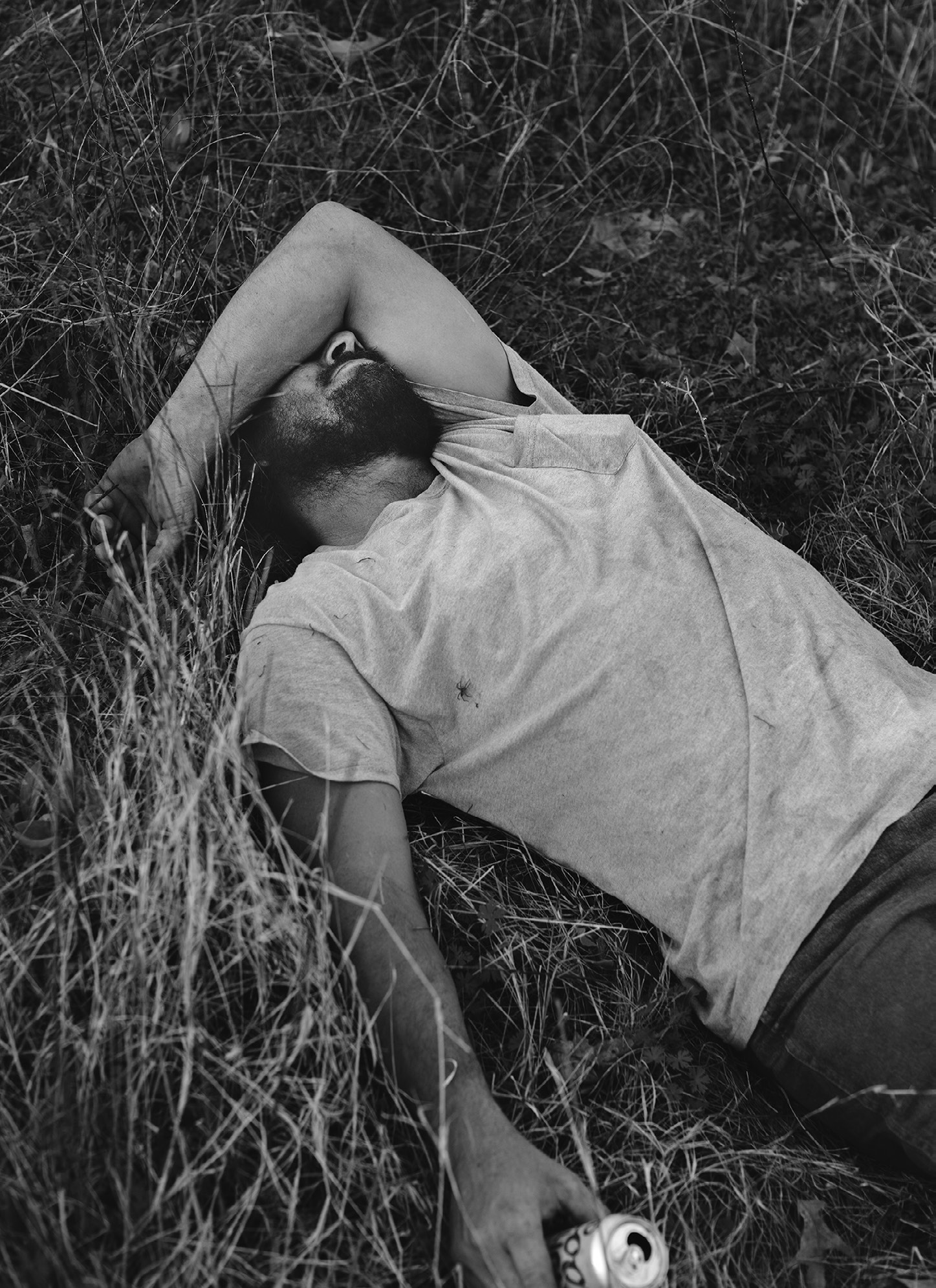 La serie Good Goddamn, por ejemplo, retrata a un amigo del autor, Kris, en los últimos días antes de entrar a la cárcel. La historia podría ser explotada por su dramatismo, pero Schutmaat elige otro camino: uno más silencioso y contenido. A través de retratos cercanos y fragmentos del paisaje texano, el libro muestra la tensión entre libertad y encierro, entre lo que está por perderse y lo que insiste en quedarse. Nada se subraya. No hay moraleja. En una de las fotos, Kris descansa en el pasto con el rostro cubierto por un brazo. Su polera está sucia y arrugada, y una pequeña araña pareciera moverse sobre su pecho. Sostiene una lata vacía en la mano. A veces, la sensación que transmite la imagen es paralela a la experiencia de hacerla (el silencio, la emoción). “Otras veces, no —cuenta—. El viento sopla, o estoy frustrado tratando de capturar la luz en el momento justo. Con las personas, a menudo sucede que la tristeza que se ve en el retrato no coincide con la interacción social, que suele ser más distendida”. Como en el cine de Terrence Malick o en la prosa de William Faulkner, el relato está menos en los hechos que en la atmósfera que los envuelve.