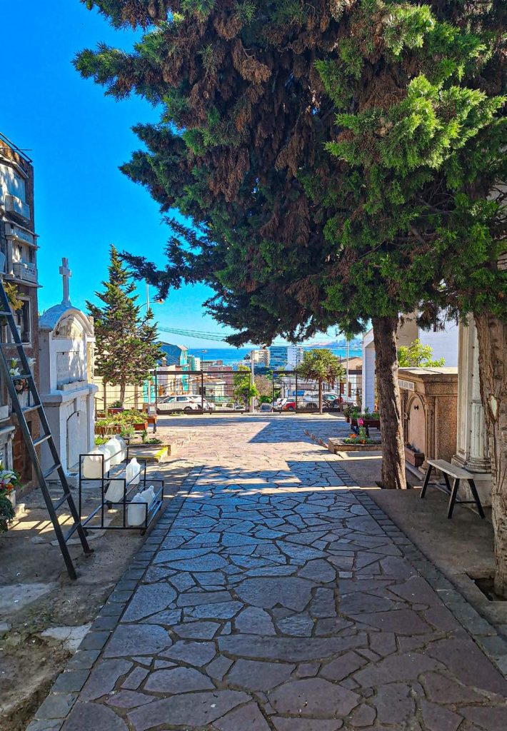 Es posiblemente el cementerio más viejo de Viña del Mar; otro menos antiguo pero que también está en medio del barrio es el de Santa Inés. En Valparaíso están los Cementerios n.° 1 y n.° 2, ambos emplazados en el cerro Panteón y declarados monumentos históricos. En general en provincia todavía hay cementerios en mitad del barrio, lo que inevitablemente permea la dinámica del día a día, por ejemplo, ya tan solo con decirle a alguien: estoy en el cementerio o te espero en el cementerio se presta para una resignificación jocosa en este caso de la situación vital. De tal manera está presente la palabra cementerio en lo cotidiano. Ahora en cambio por una cuestión práctica, sanitaria y también de la época, los cementerios están en las afueras, desplazados, de lejito nomás diría mi octogenaria vecina, por lo tanto, al salir de lo cercano irremediablemente la relación con la muerte queda fuera del horizonte diario.