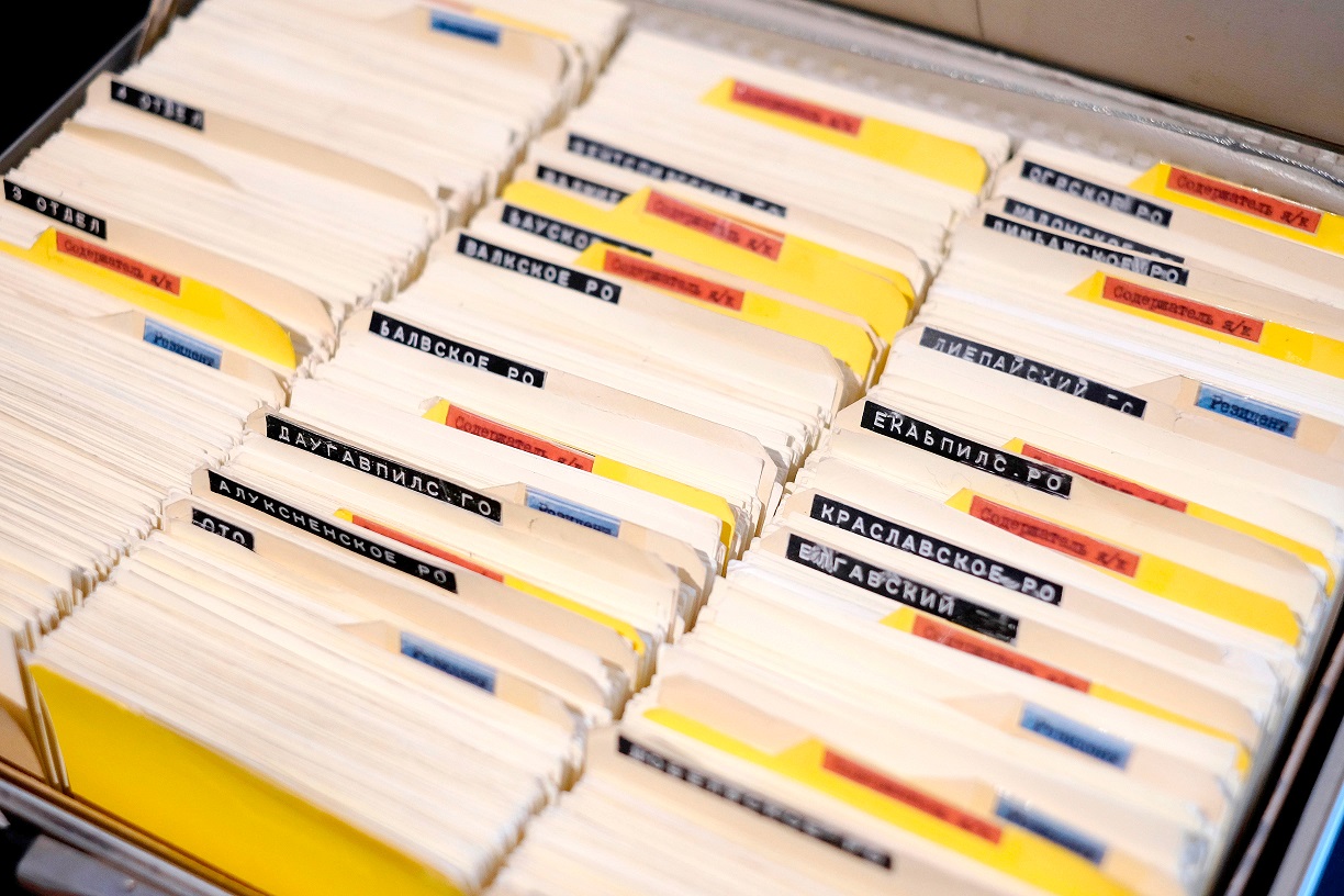 Prisoner files on display at the basement prison cells at the former KGB, or ‘Cheka’ headquarters known by locals as the Corner House in Riga capital of Republic of Latvia